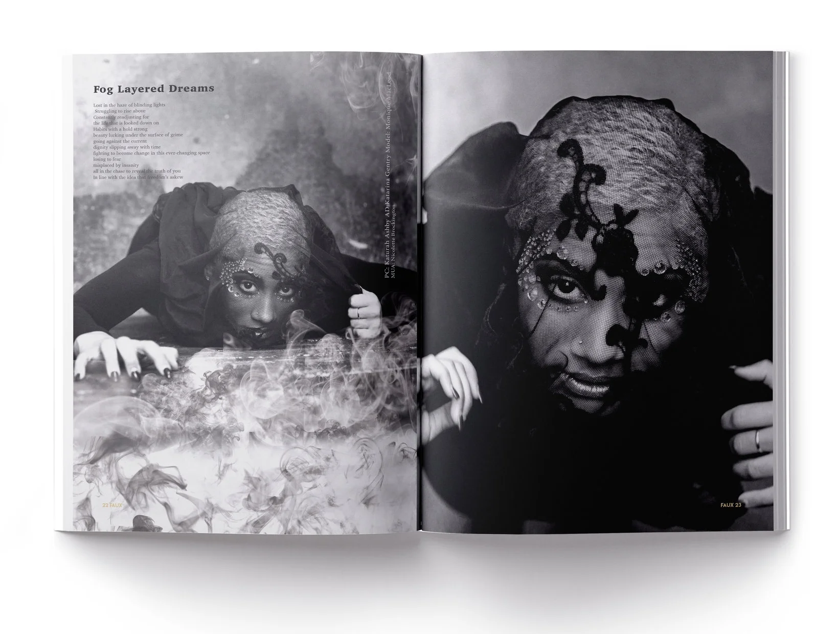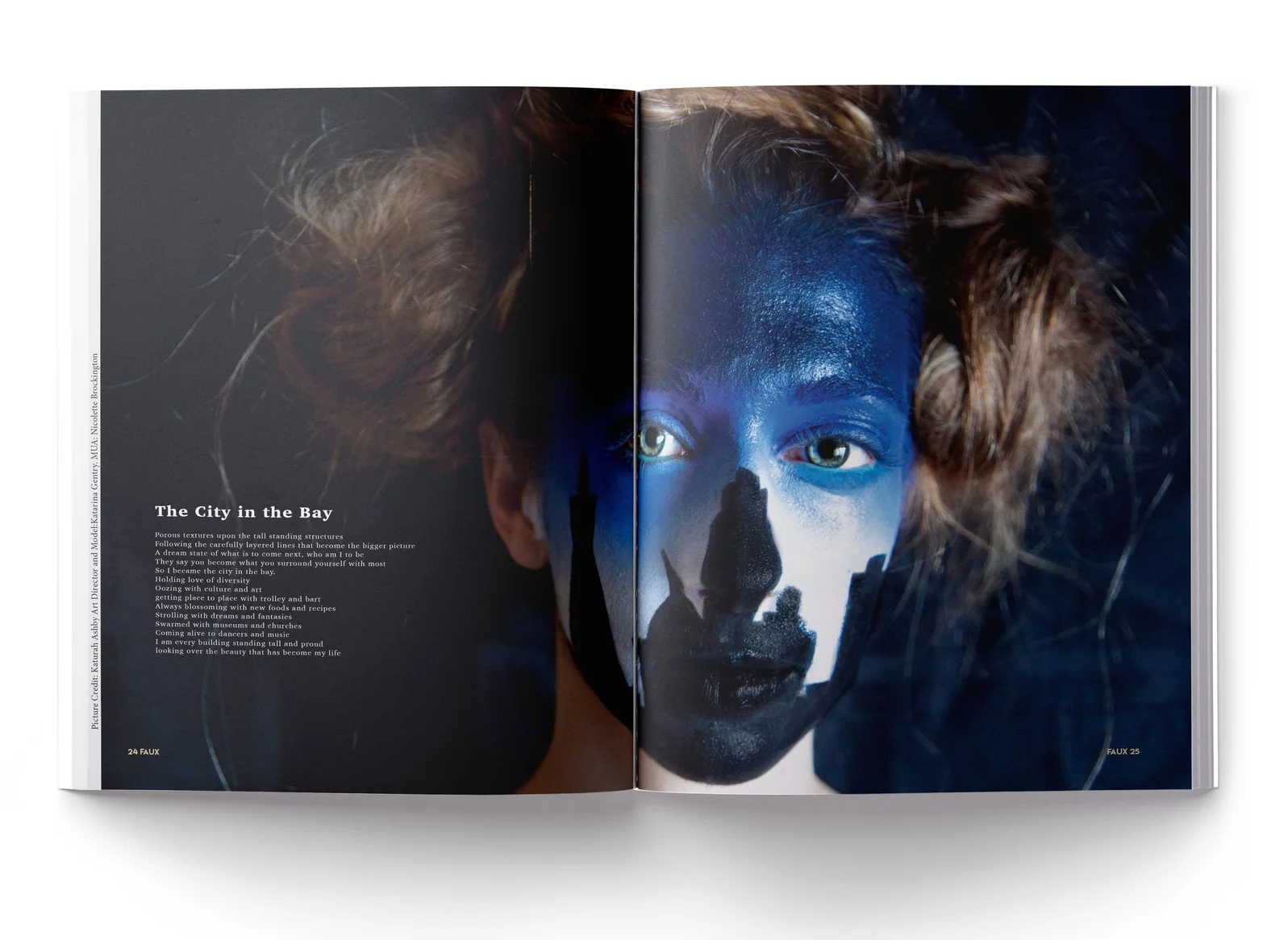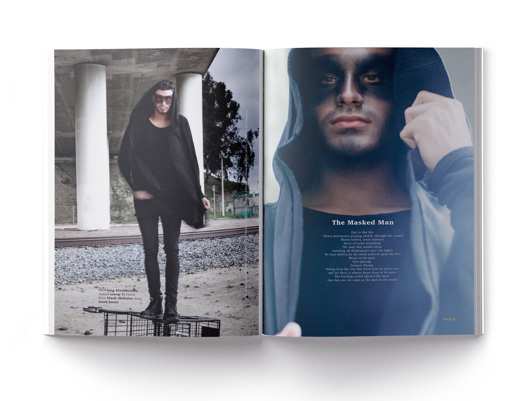 For this project I created an urban fashion magazine that has a section for fashion, mind, body and soul, and lifestyle. The idea is to show the truth behind living in the city. We often only see the flashing lights and famous monuments. In FAUX, you see the raw emotions that the people of the city carry with them everywhere. I directed the photography, makeup and modeling, edited the photos (Photoshop), set the type (Indesign), and created all ads in magazine.