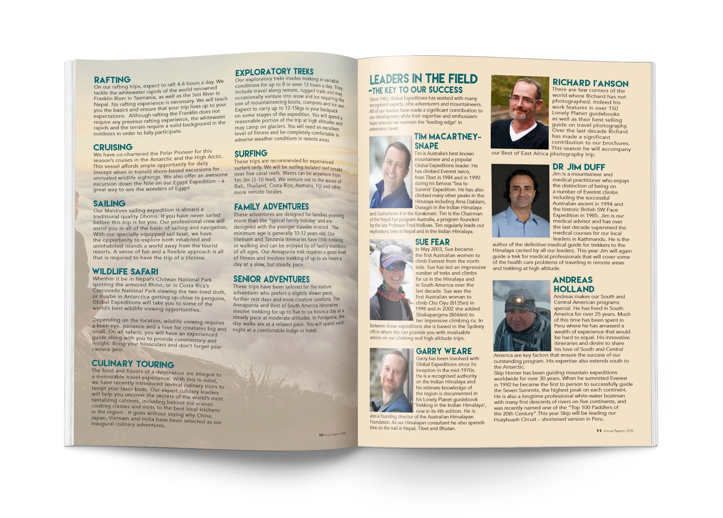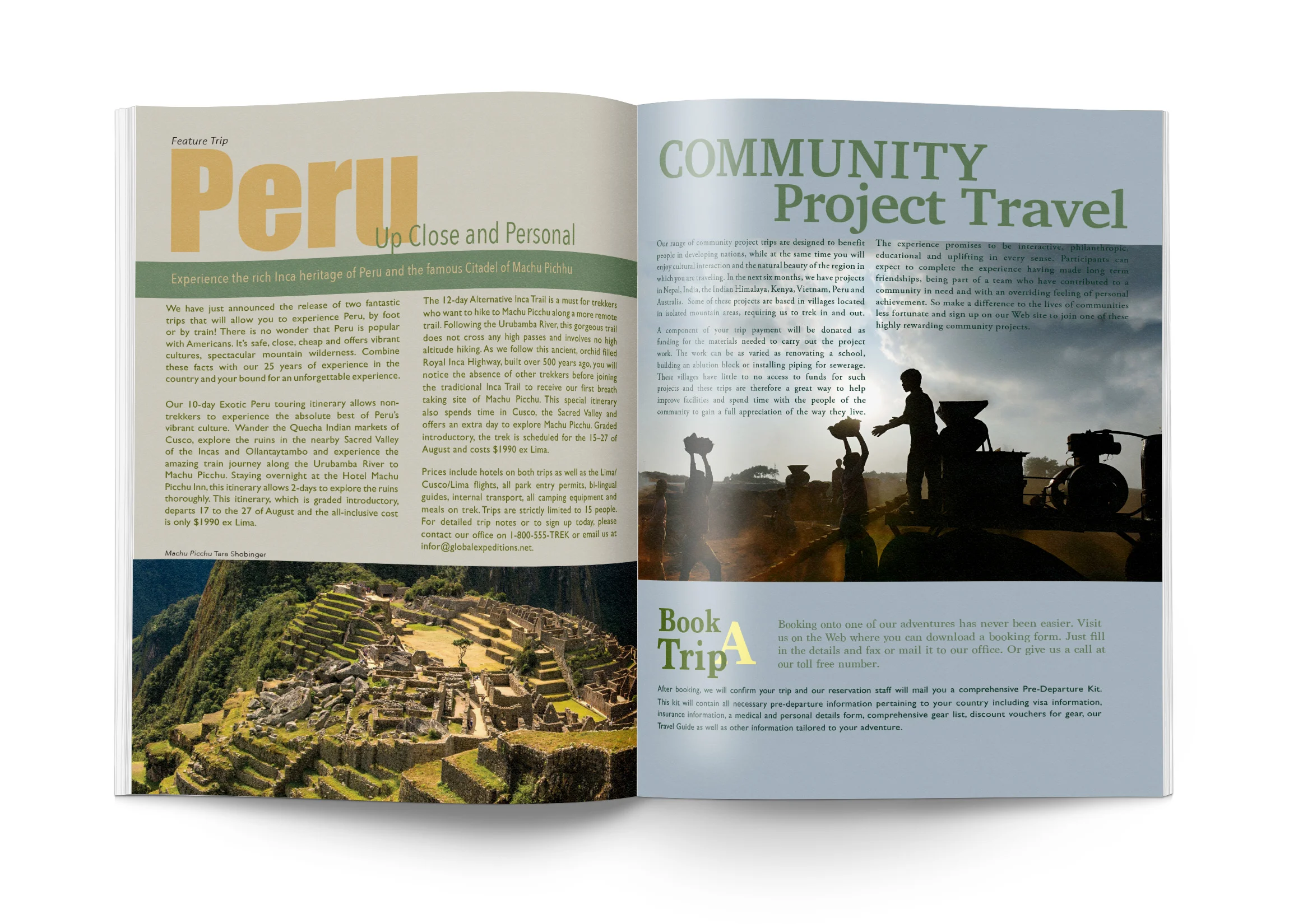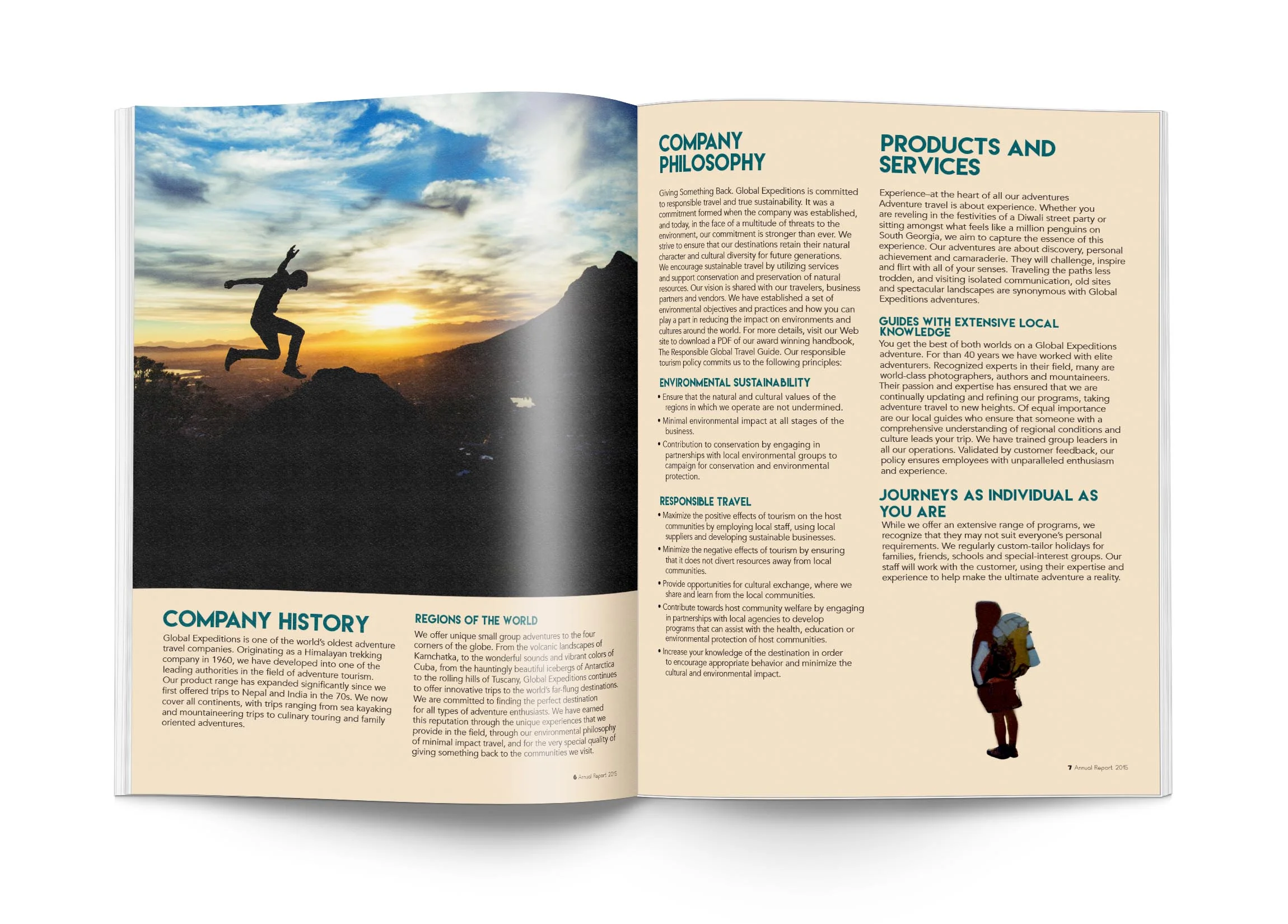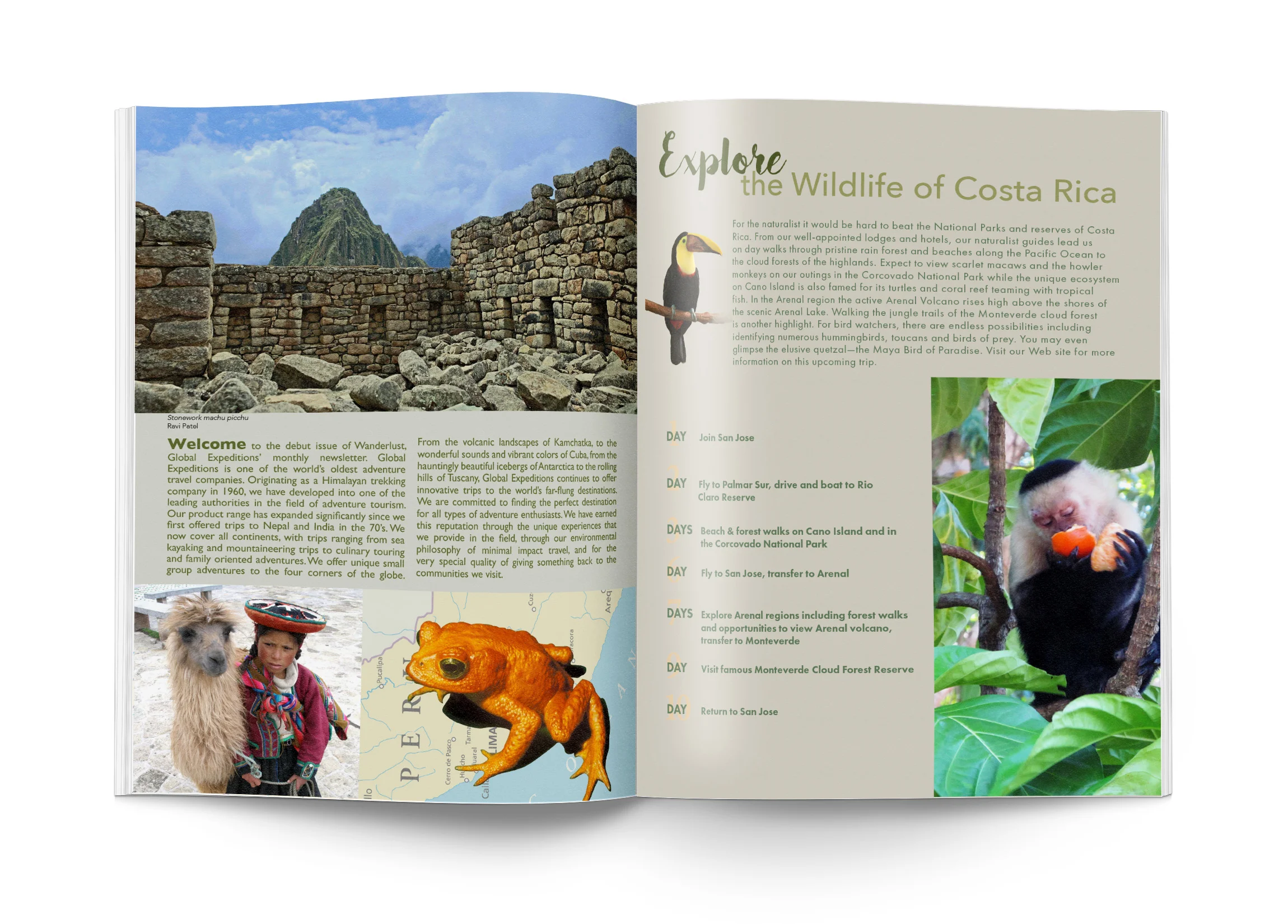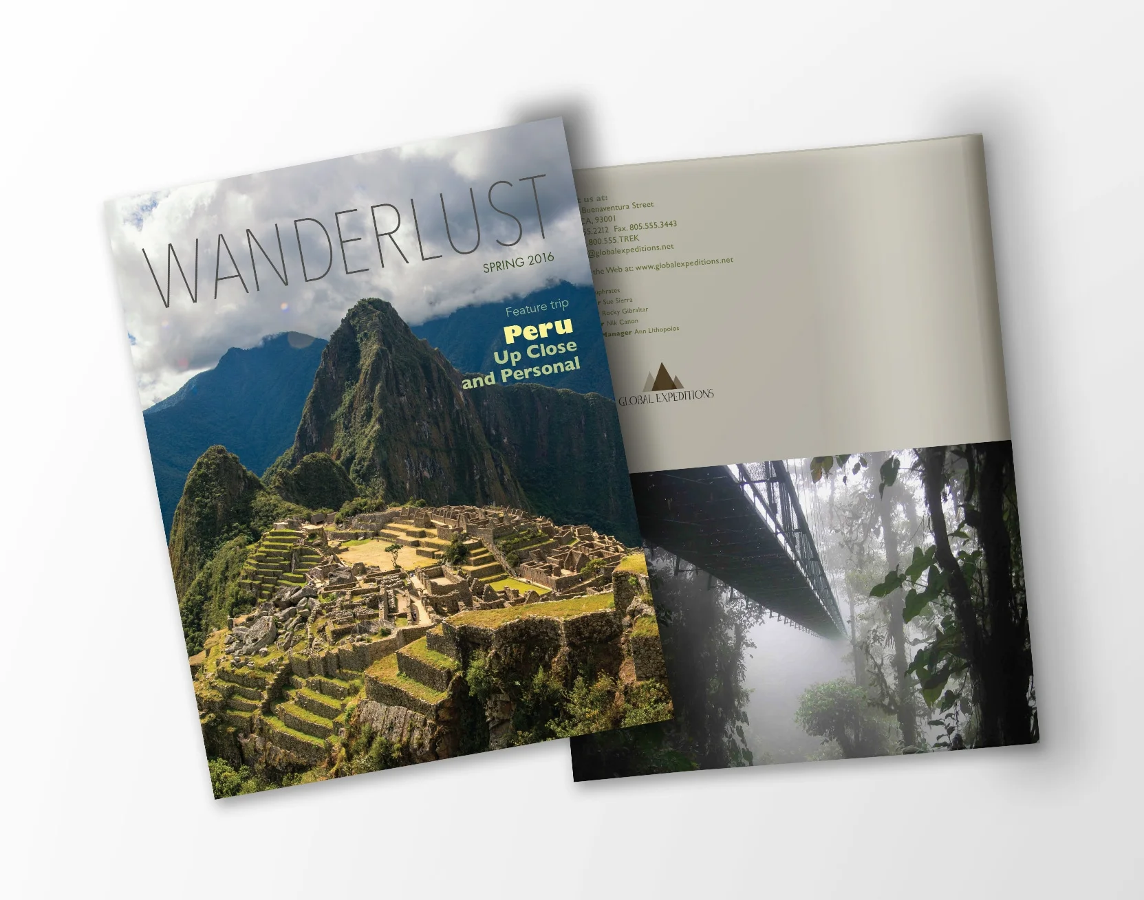Global Expeditions is a project created in Publication and Design class. The assignment was to first create a logo for the company Global Expeditions. Then, we were tasked to create a newsletter with nameplate and an annual report for the company. I created Wanderlust as an adventurer newsletter. Playing with fonts and type layout to give a more playful feel.