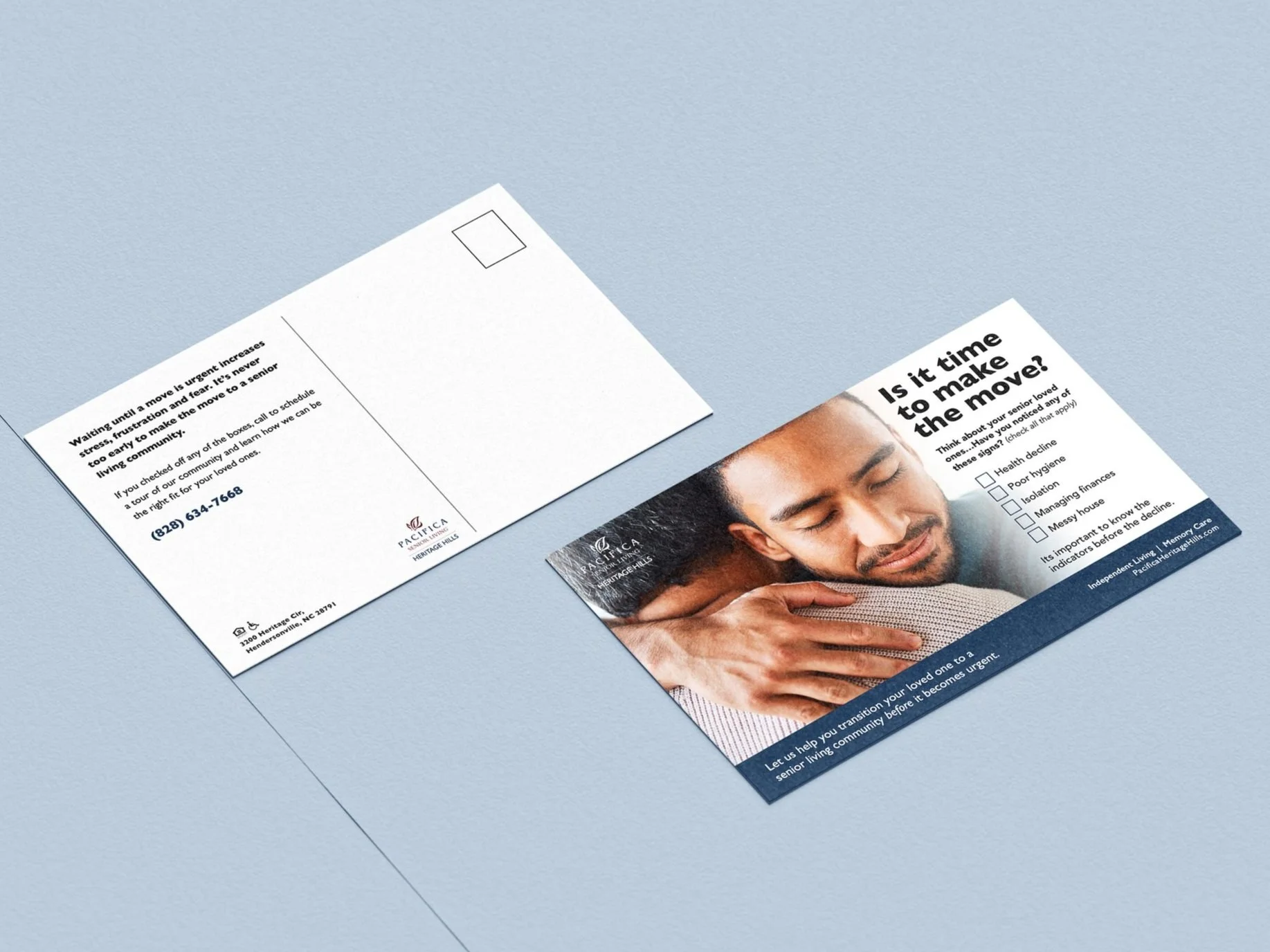 Using After Effects to create a simple GIF to post to social accounts. This campaign is meant to capture the families that start to notice a health decline of their older relatives. The GIF was shared digitally while the postcard was sent in the mail. Being front of mind on digital vs print to capture all audiences.